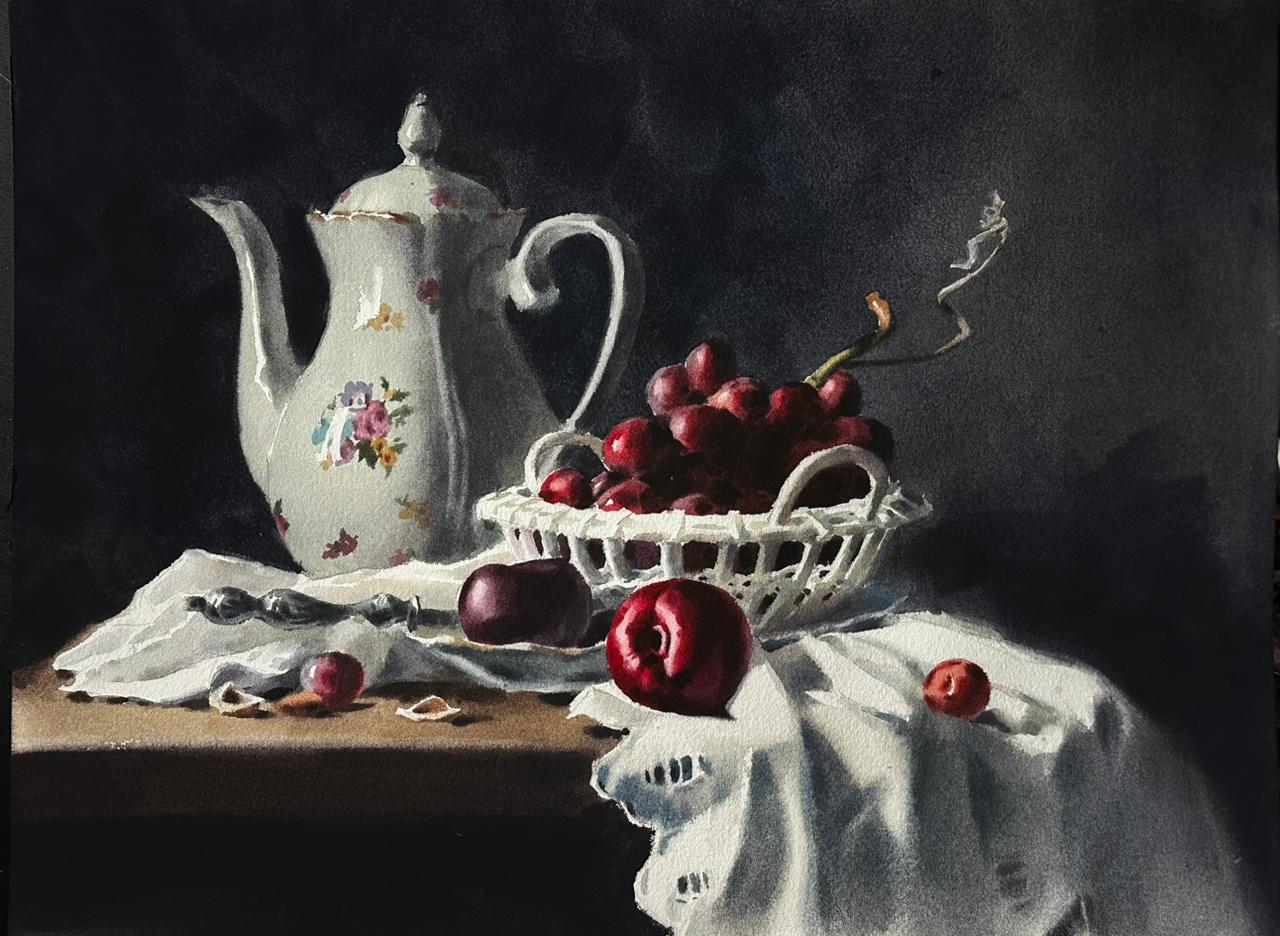 Разберём богатство фактур, оттенки одного и того же цвета в каждом отдельно взятом натюрморте: зеленый, красный, голубой, глубокий синий, белый и оттенки бежевого. Техника акварели а-ля прима поможет создать прозрачные, но в тоже время насыщенные цветом и объёмом натюрморты.